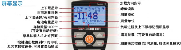 測量值實際顯示及峰值顯示 記錄第一峰值/第二峰值功能 3/8"方榫接口 高速7000Hz采樣頻率 1000個數據存儲帶統計功能輸出 USB,RS-232,Mitutoyo,及模擬輸出端口 斷裂識別/自動輸出/自動清零/自動存儲功能 密碼保護功能設置防止意外更改測量設置 上下限報警及通過/失敗判斷 5種測量單位切換 電池及交流適配器供電
